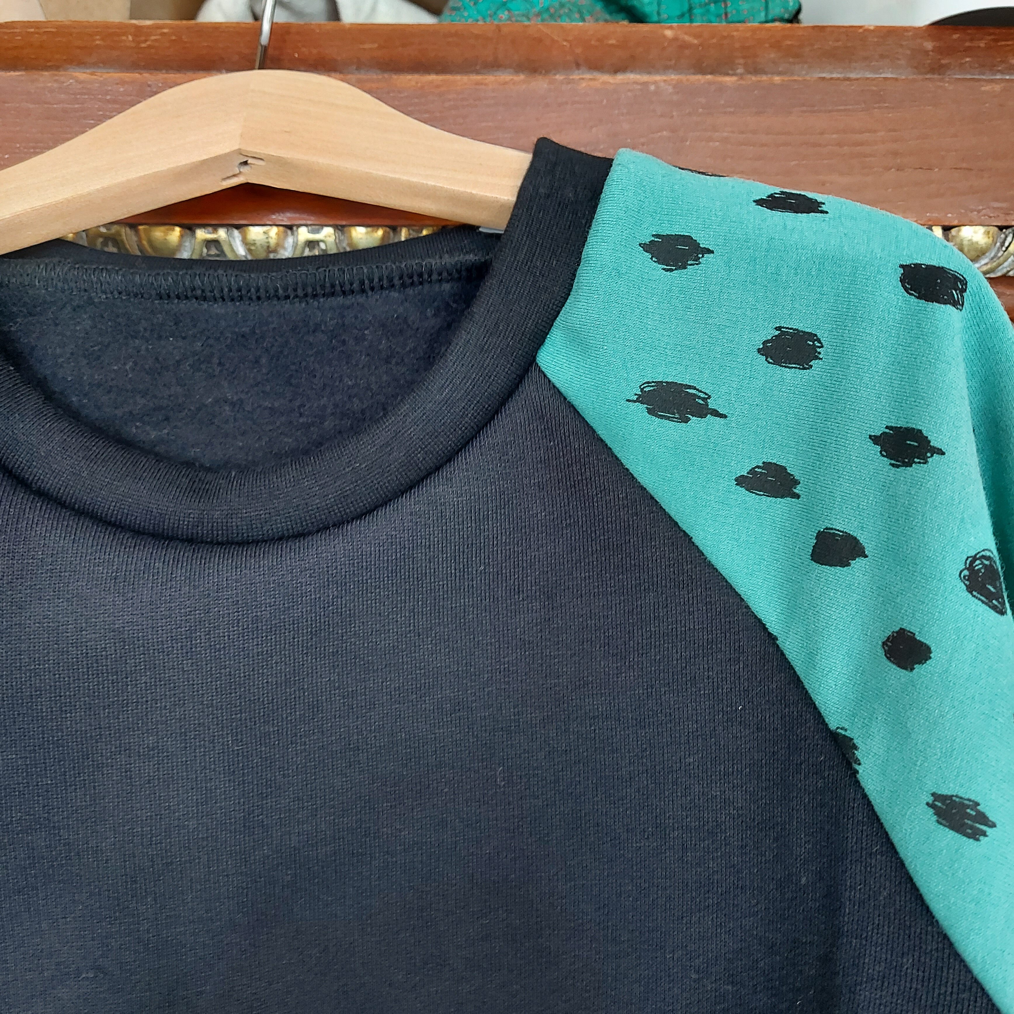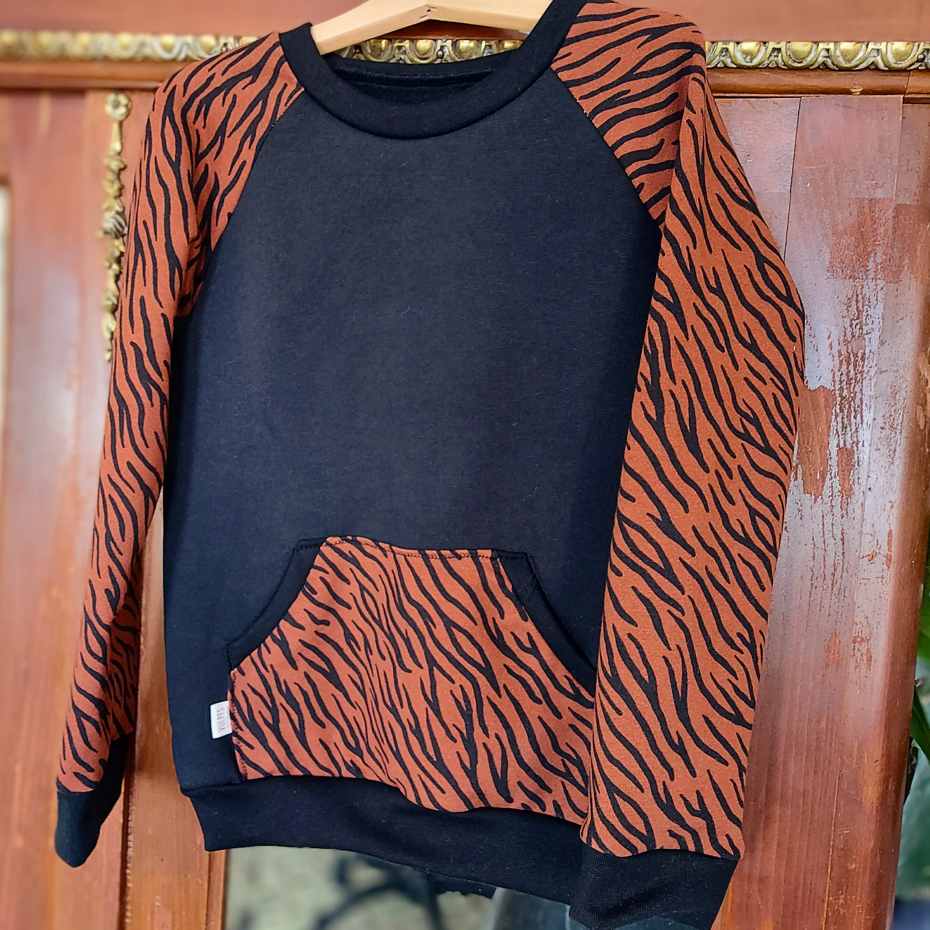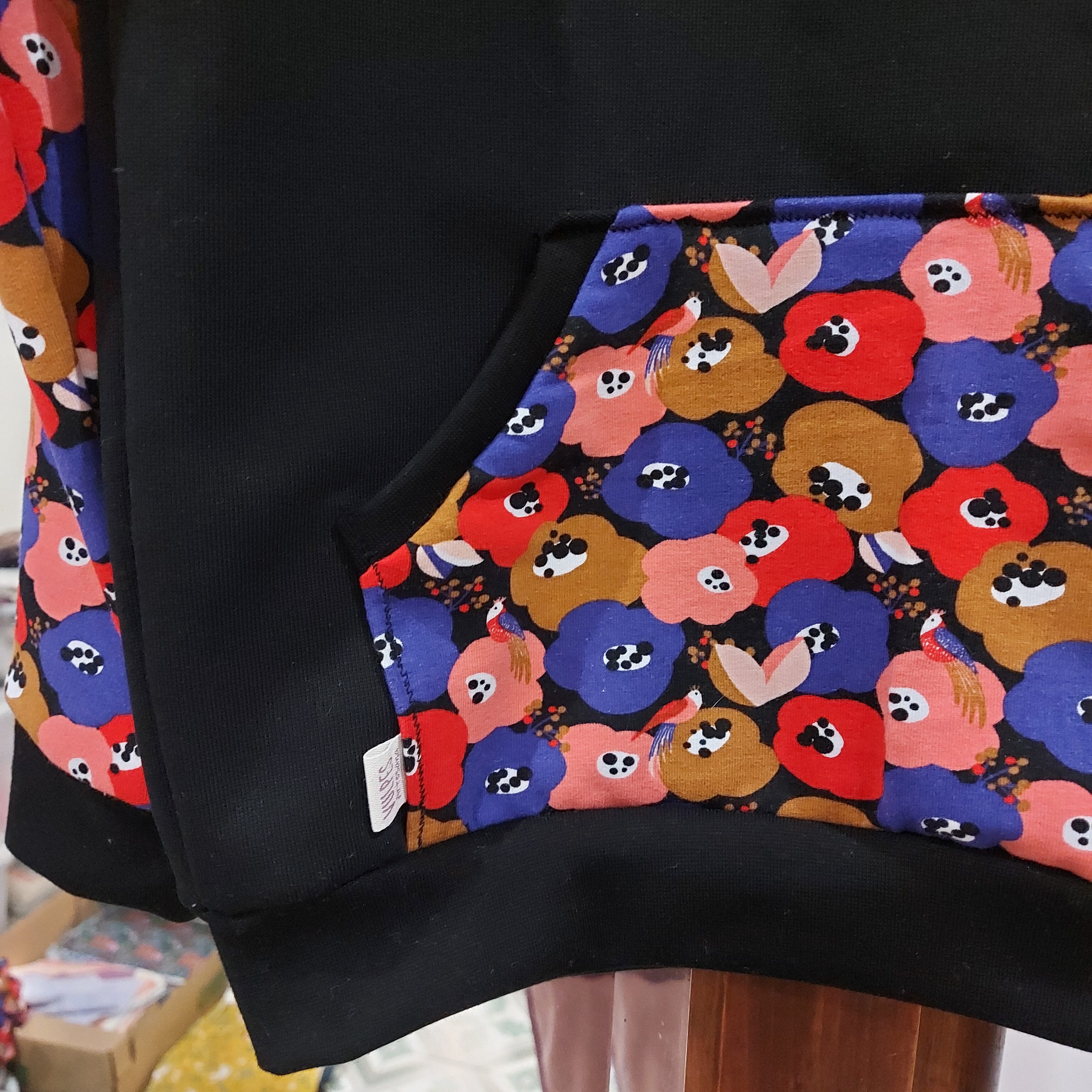 Color negro con mangas y bolsillo estampados, disponible en talla 9-10 años y tres colores diferentes.